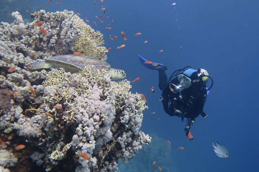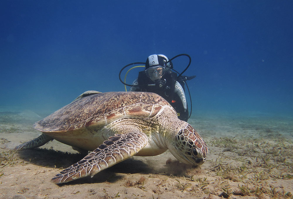 Ein Tagesausflug ging nach Abu Dabbab zu einer Seegraswiese, wo wir einige Schildkröten aus nächster Nähe antauchten und sie beim Fressen beobachten konnten. Max begleitete uns hier mit seiner Schnorchelausrüstung und hatte einen Superblick auf uns von oben herab.