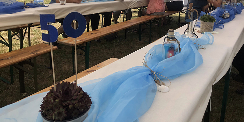 Die Tischdekoration war einfach sehenswert. Die Flaschenpost auf den Tischen zeigte Taucher mit besonderer Deko. Und die Beleuchtung am Abend wurde von den vielen mit Sand gefüllt, dekorierten Flaschen übernommen. Es sah sehr gemütlich aus. Rundum kann ich sagen, es war ein sehr schönes Jubiläums-Sommerfest.